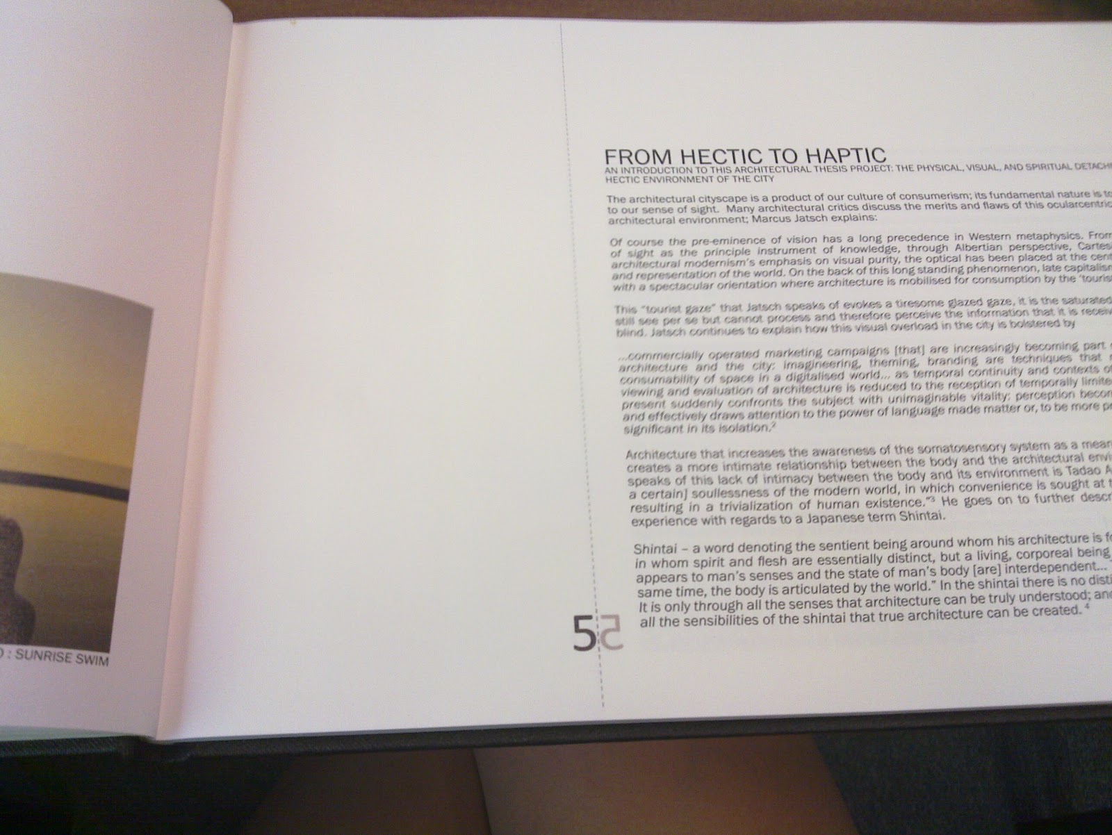 First one was called 'total immersion'. Fascinating thesis about the importance of the sense of self in architecture- quite similar to what i want to do right? He started of explaining the importance of senses and so forth, very little research done in the sense that only 1/4 of the book was analyzing hypothetically and the rest was site study and analysis and so forth.